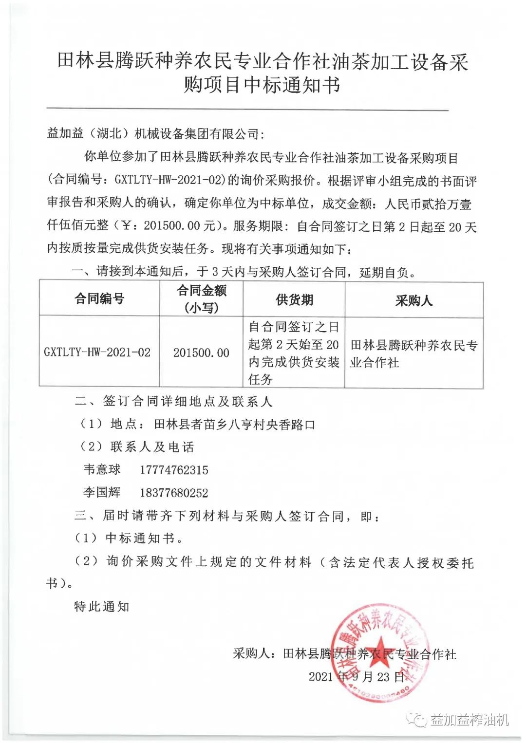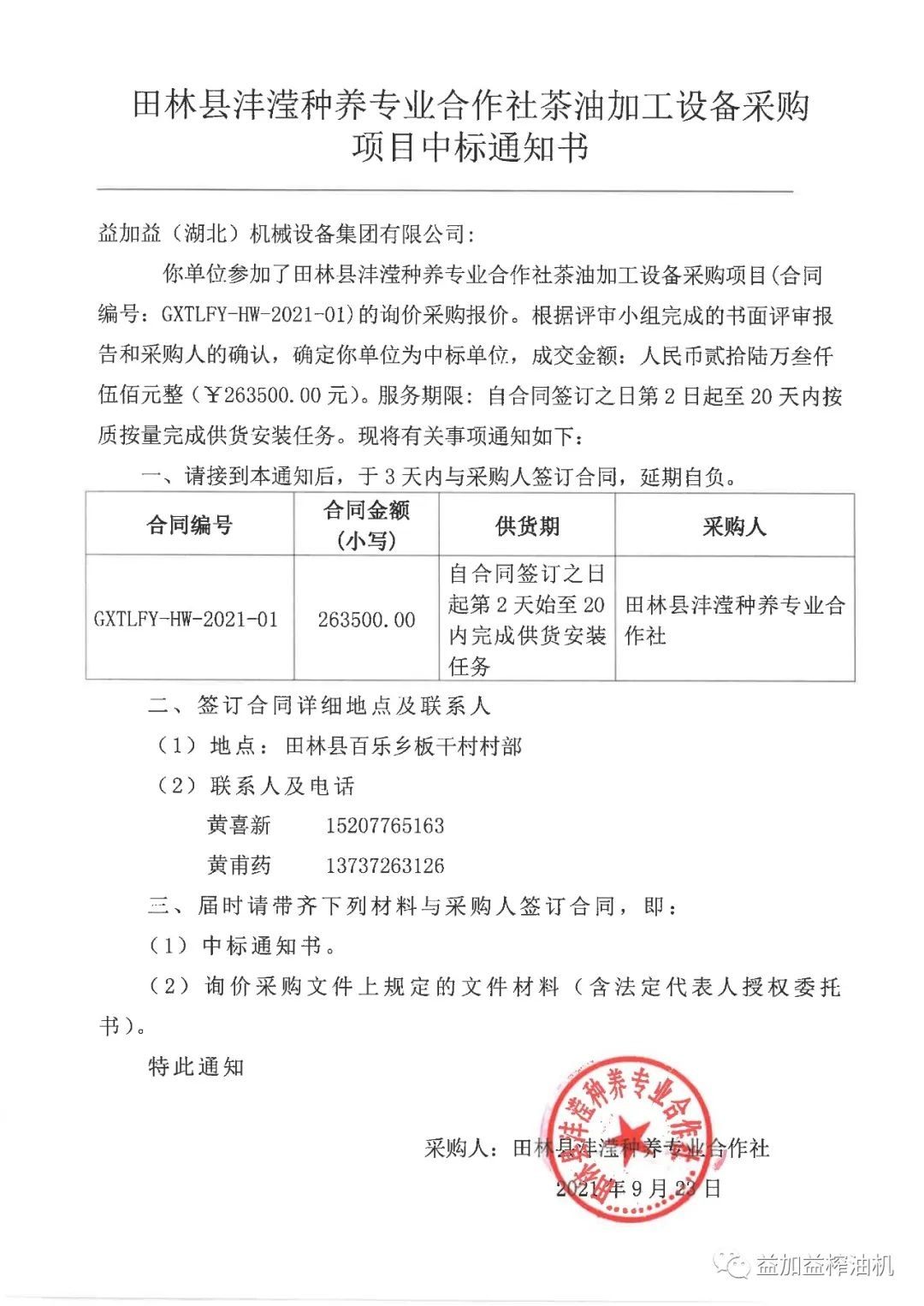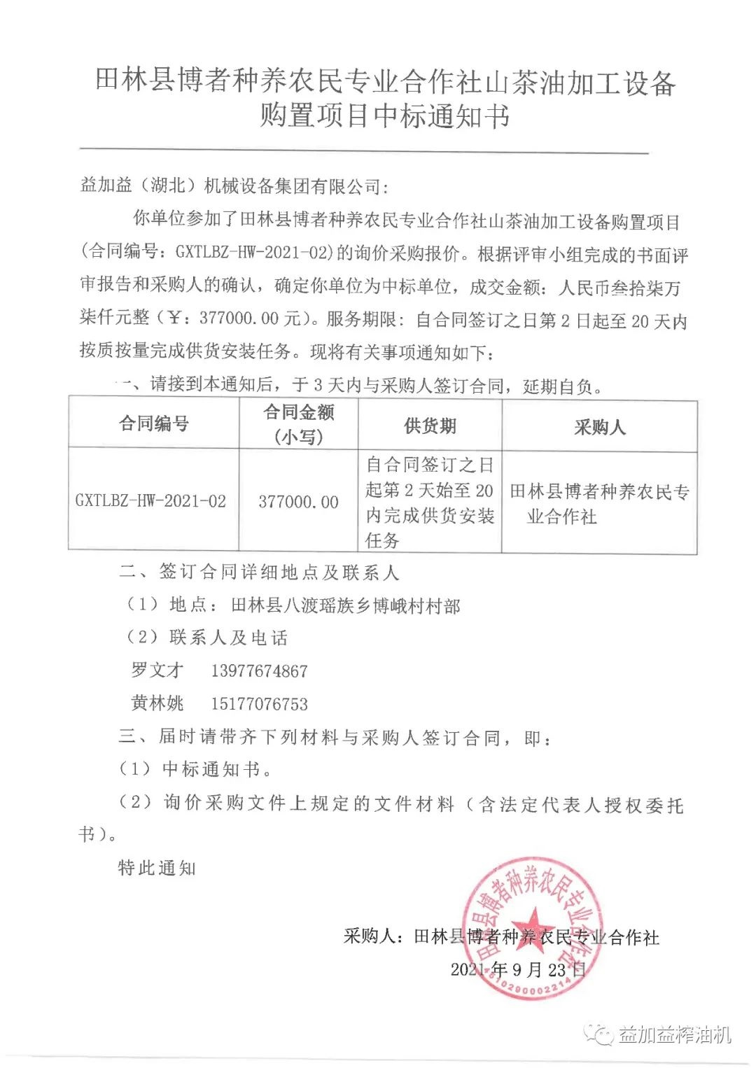 益加益集團憑借過硬的產(chǎn)品質(zhì)量,扎實高效的工作作風,卓越的運作團隊和良好的企業(yè)信譽,在眾多競爭對手中脫穎而出,連續(xù)中標《中華人民共和國世界銀行貸款廣西貧困片區(qū)農(nóng)村扶貧試點示范項目》中全部11家專業(yè)合作社山茶油加工設備的招標購置。
