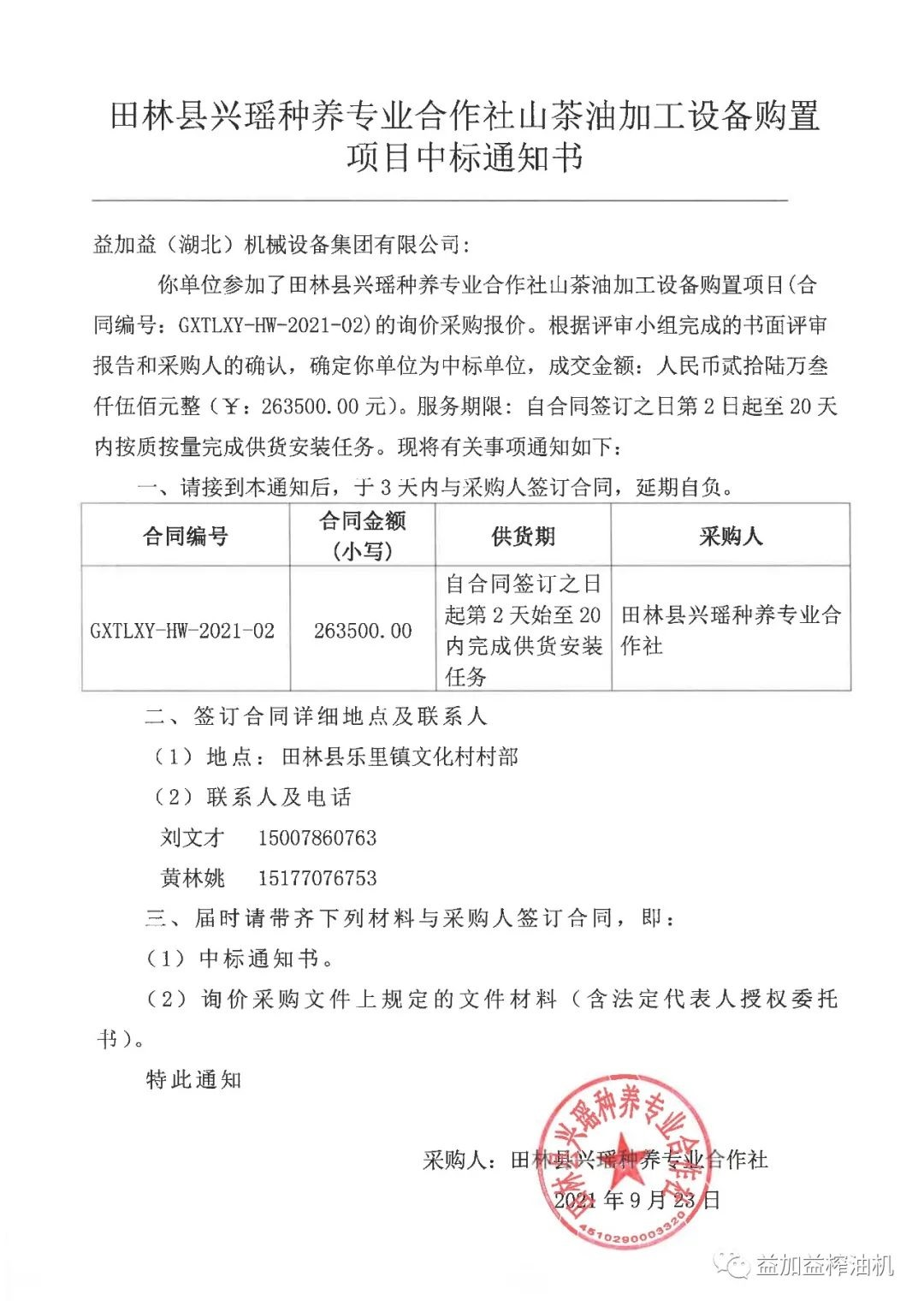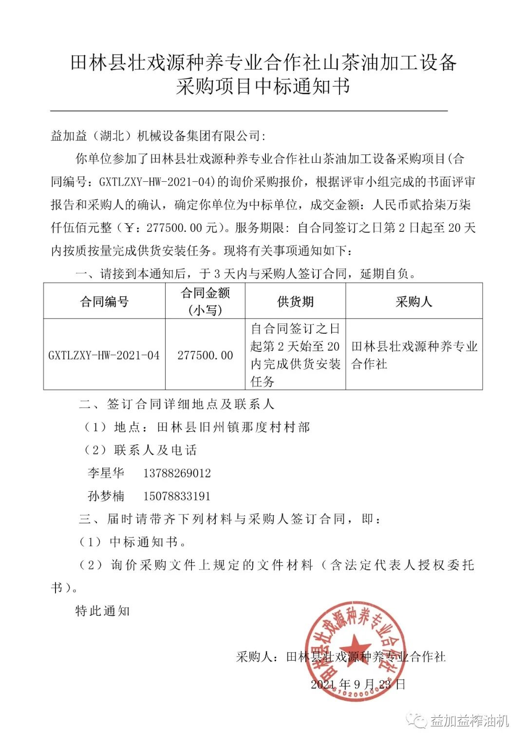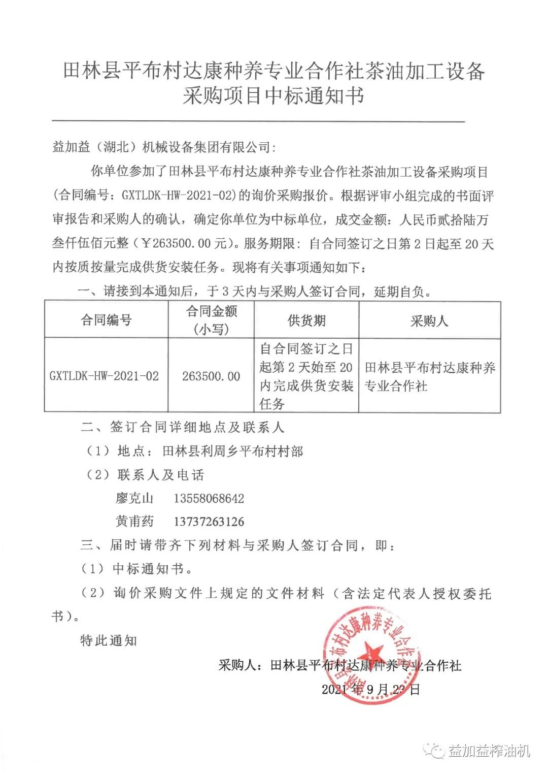 益加益集團憑借過硬的產(chǎn)品質(zhì)量,扎實高效的工作作風,卓越的運作團隊和良好的企業(yè)信譽,在眾多競爭對手中脫穎而出,連續(xù)中標《中華人民共和國世界銀行貸款廣西貧困片區(qū)農(nóng)村扶貧試點示范項目》中全部11家專業(yè)合作社山茶油加工設備的招標購置。