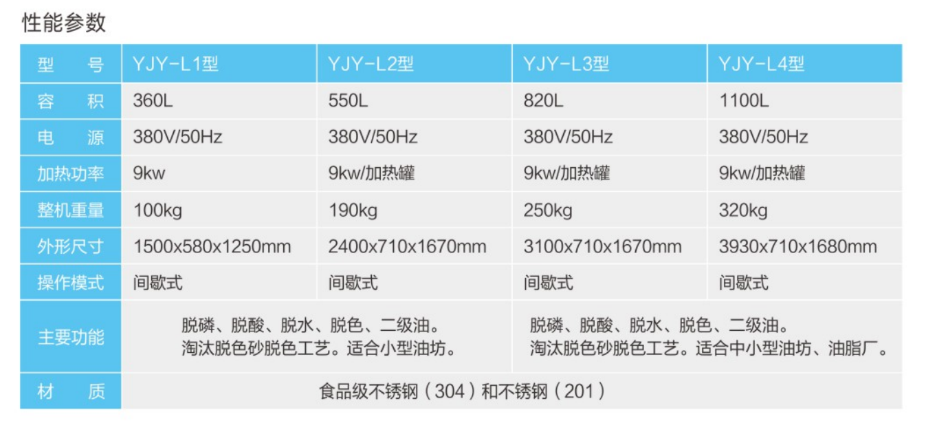 ★采用不銹鋼材質(zhì),可實(shí)現(xiàn)油品的脫磷、脫酸、脫水功能,根據(jù)用戶需要還可以進(jìn)行恒溫脫色。